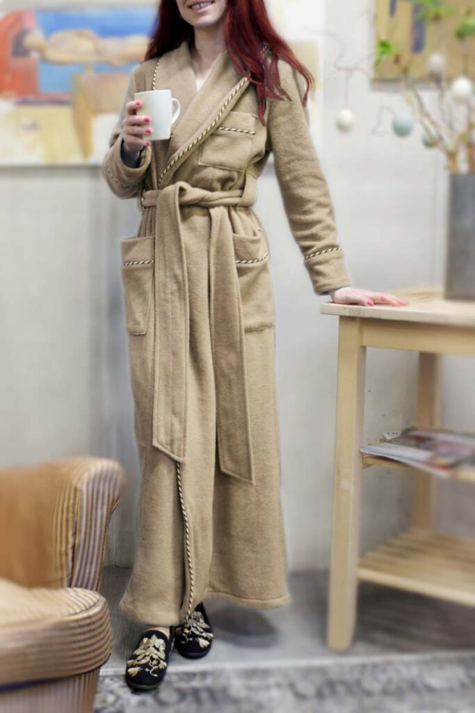 Jeder Morgenmantel wird auf Bestellung gefertigt und ist in verschiedenen Größen und Längen erhältlich, die Sie auswählen können.