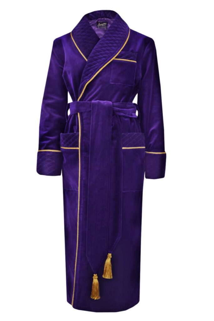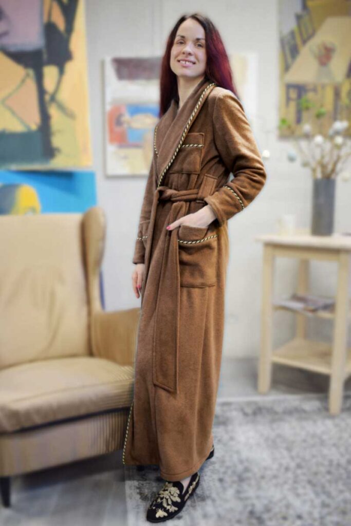 Black and gold striped cord piping adorns the edges, elevating the robe’s aesthetic appeal and adding a subtle hint of luxury. Whether you’re lounging at home, relaxing at the spa or getting ready for the day ahead, our fleece dressing gown is the perfect choice for cozy comfort and effortless style.